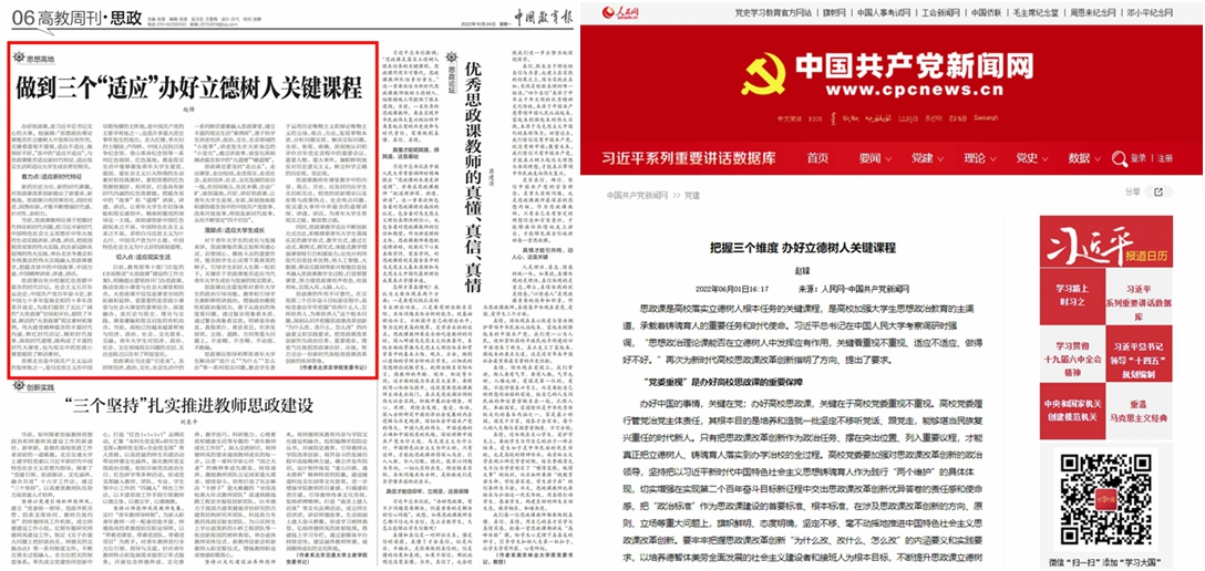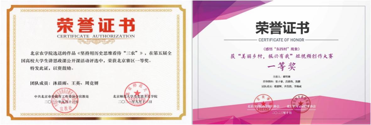 突出特色,打造“红绿融合”思政金课。立足农林高校办学特色和知农爱农新型人才培养需求,学校积极探索思政课改革创新路径,通过建章立制引领“红绿融合”、上下联动推动“红绿融合”、全方位评教保障“红绿融合”、理论宣讲促进“红绿融合”、成果凝练突出“红绿融合”,全面推动将思政课“红”的底色与农业院校“绿”的特色深度融合,取得了明显成效。在校学生对思政课教学满意度逐年提升,思政课教师获得了一系列“红绿融合”式的教学、科研和社会服务优秀成果,思政课教师指导的作品《脱贫攻坚》《用历史思维看待“三农”》先后两次荣获全国高校大学生讲思政课竞赛北京赛区一等奖;主持申报的《“四史”教育融入高等农业院校思政课教学长效机制研究》荣获市教委“本科教学改革创新项目”“四新”建设重点项目;编写的《农耕文化与农耕文化教育》获得国家林业和草原局“十四五”规划教材首批立项;申报的教学课例《建设美丽中国》荣获市委教育工委“永远跟党走”大中小学思政课优秀教学课例征集展示活动一等奖;思政课教师调研起草的《利用数字经济和技术优势加快推进我市红色资源数字化提升保护利用和宣传水平》政策建议报告,得到市领导批示,被纳入《市长参阅》。《打造“红色基因、首善标准、北农特色”思政金课》获批北京高校党建和思想政治工作培育项目,被纳入北京高校思政课改革创新优秀案例库。中国教育报、人民网、光明网等对世俱杯思政课改革创新的做法和经验进行了深入报道。