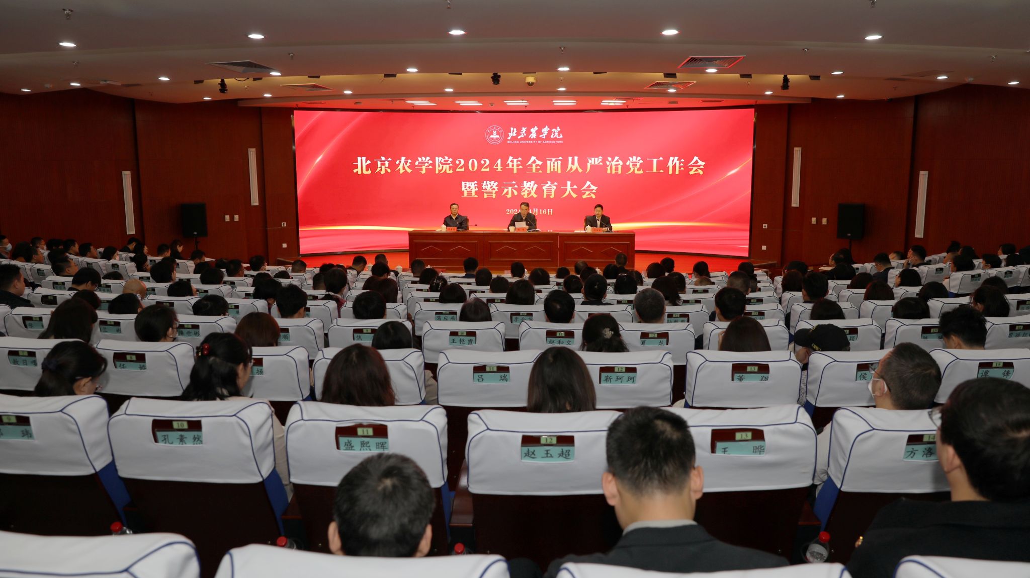 4月16日,学校召开2024年全面从严治党工作会暨警示教育大会,深入学习贯彻习近平总书记在二十届中央纪委三次全会上的重要讲话和全会精神,贯彻落实中央、教育部党组和北京市委、市委教育工委关于全面从严治党的决策部署和要求,纵深推进学校全面从严治党工作,为落实立德树人根本任务、推动学校事业高质量发展提供坚强政治保证。党委书记赵锋以《以首善标准开展党纪学习教育 坚定不移推动全面从严治党向纵深发展 为都市农林特色高水平应用型大学建设提供坚强保障》为题讲授党纪学习教育专题党课。会议由党委副书记、院长段留生主持。
