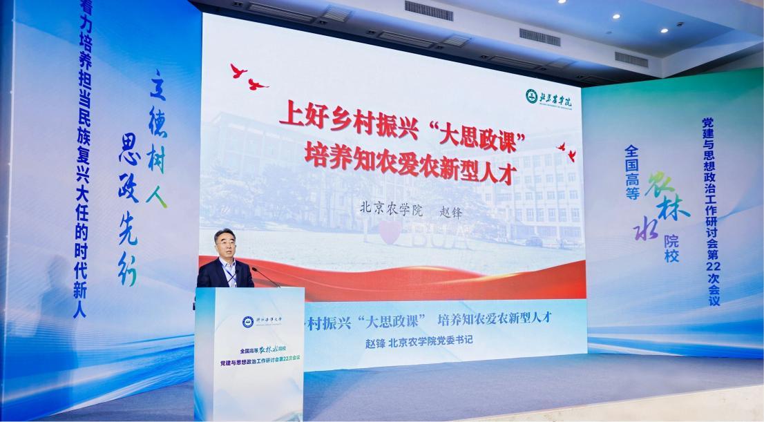赵锋在发言中重点介绍了近年来学校深入贯彻落实习近平总书记的重要论述和重要指示精神,立足自身特色,努力打造首善标准、红色基因、北农特色乡村振兴“大思政课”,培养德智体美劳全面发展的知农爱农新型人才的做法、经验和取得的成效。