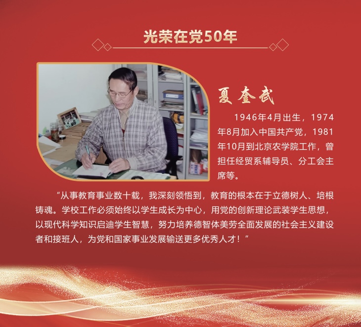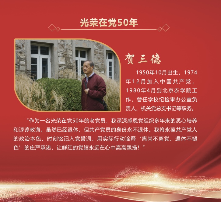 五十载初心如磐,半世纪信仰弥坚。根据中央和北京市委有关文件精神,学校向党龄达到50周年、一贯表现良好的党员颁发“光荣在党50年”纪念章。夏奎武、贺三德、陈培珠、王玉洁4名党员获此荣誉。他们始终坚定理想信念、坚守初心使命,用奋斗和耕耘践行入党誓词,用心血和智慧为学校改革发展贡献力量,用付出和奉献诠释对党的忠诚。