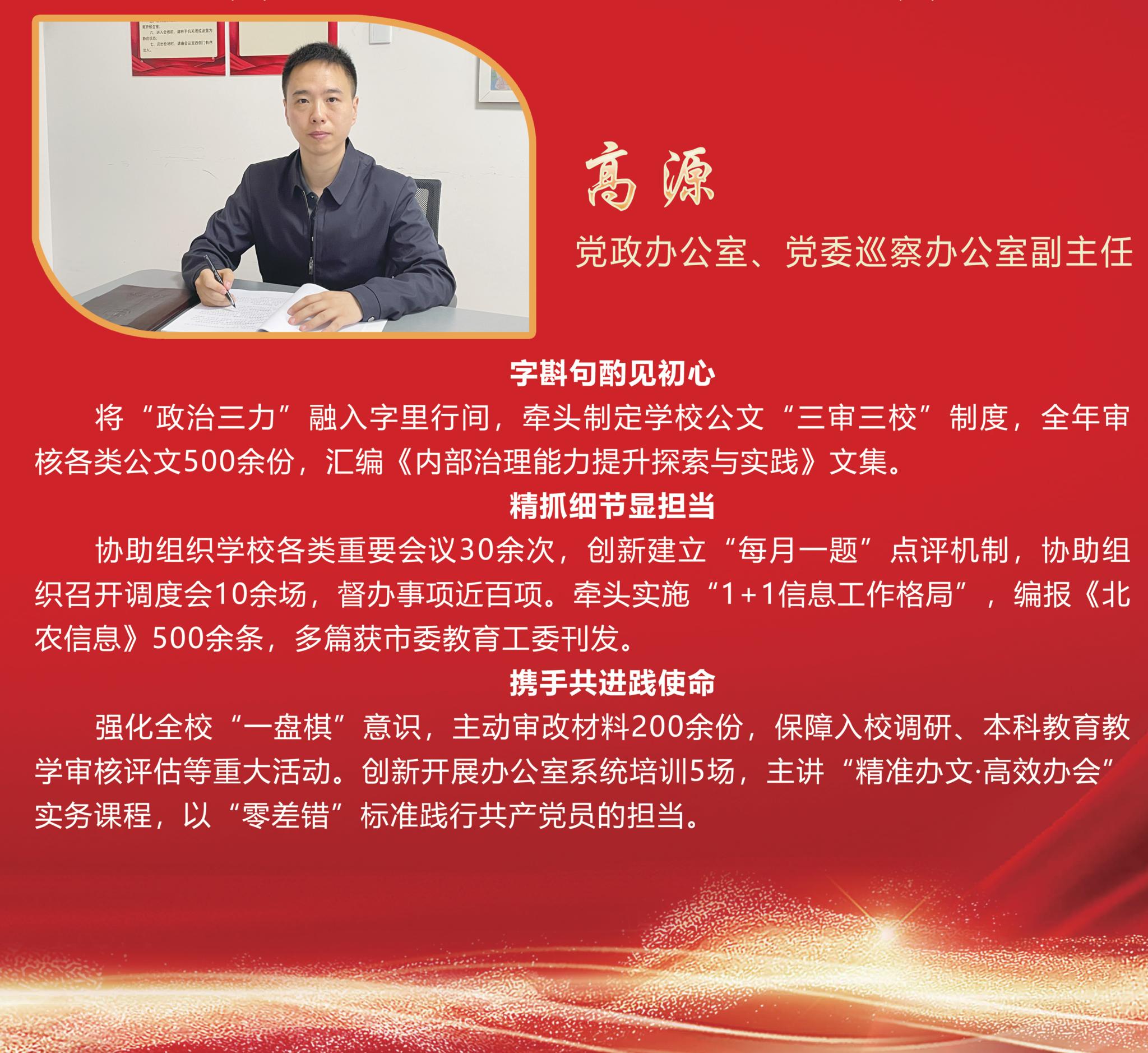 6月30日,学校党委发布《关于表彰优秀共产党员、优秀党务工作者和先进基层党组织的决定》,15名同志荣获“世俱杯sjb官网优秀共产党员”称号,他们紧密围绕“落实教育强国建设纲要 推动学校事业高质量发展”主题主线,以“实干创先年”为抓手,奋勇争先、担当作为,充分发挥党员先锋模范作用,为推动学校事业高质量发展作出积极贡献。
