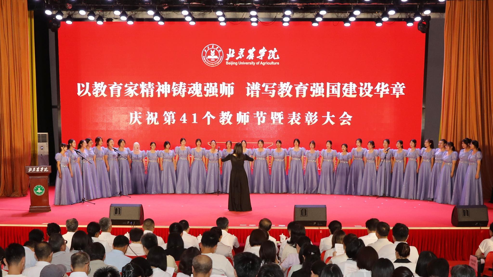 会上播放了致敬北农教师视频《躬耕筑梦》。学生合唱团献唱《世界赠予我的》《每当走过老师窗前》,表达了对学校全体教师的深深感谢,并为敬爱的老师们送上真挚的祝福。