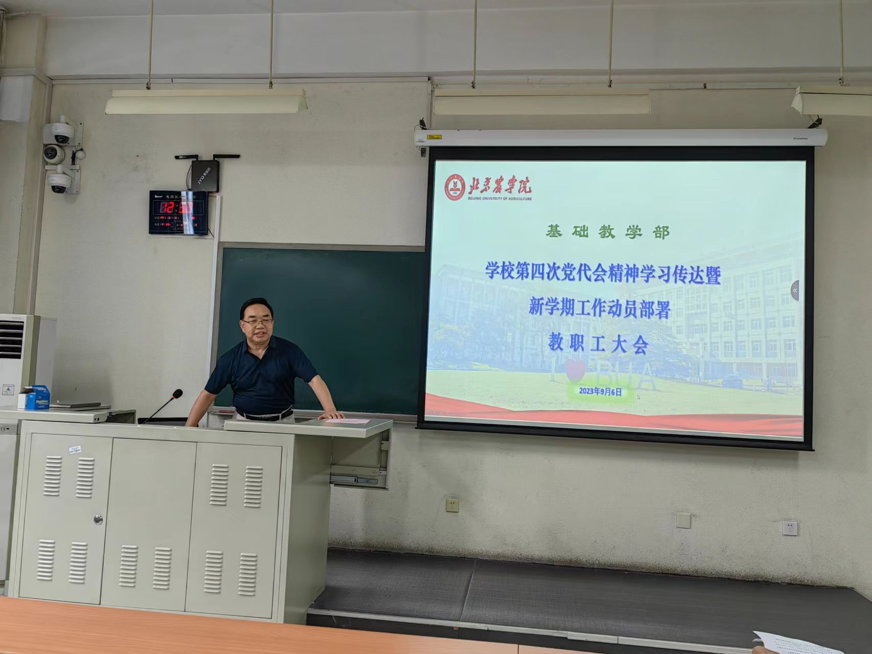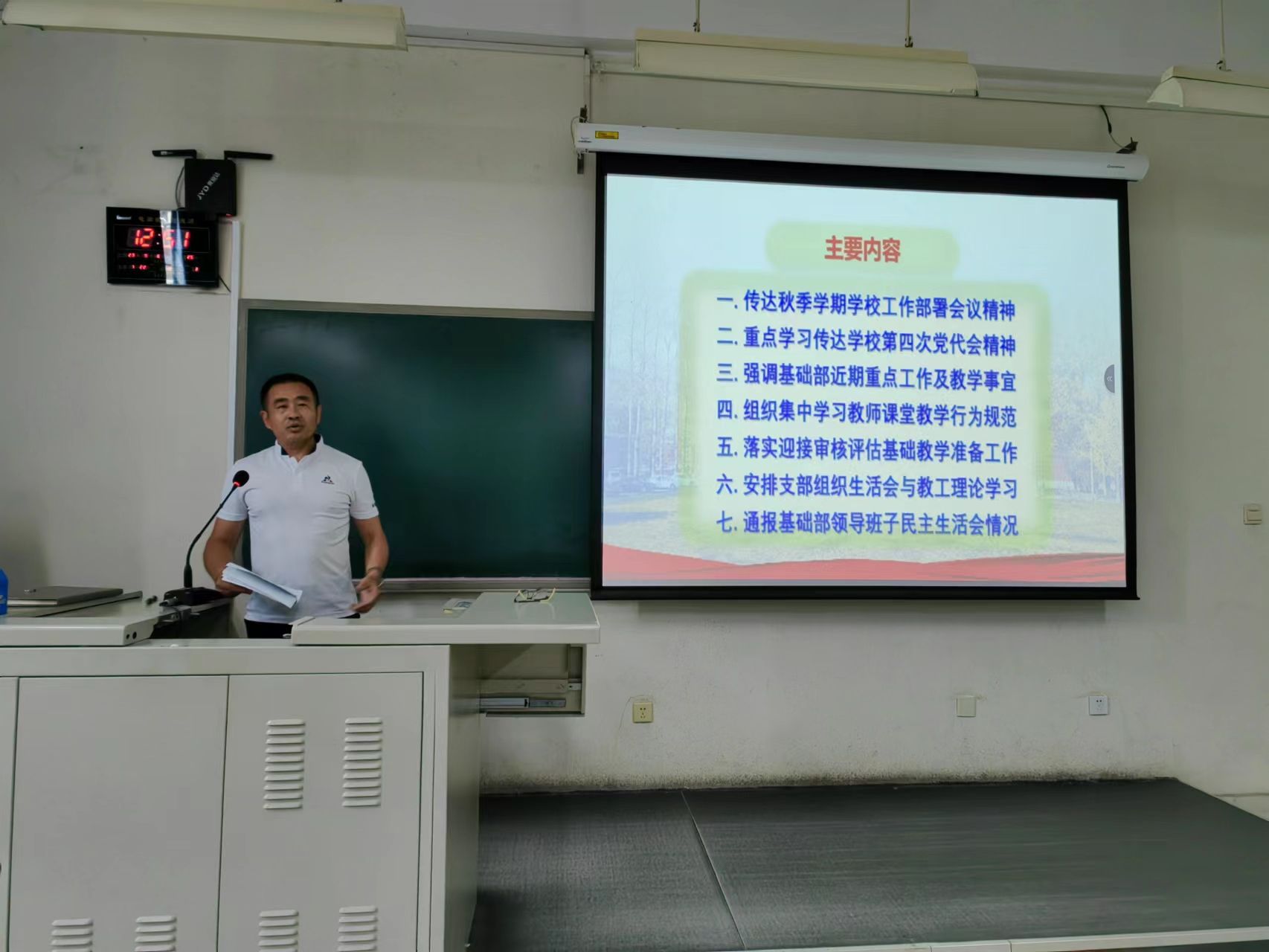 9月5日中午,基础部召开全体教职工大会,及时传达学习学校第四次党代会精神,传达秋季学期学校工作会议精神。会议由基础部党总支书记马修地主持,全体教职工参会。