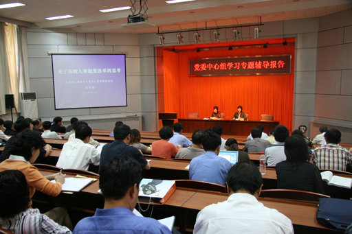 下午,党委中心组进行了2006年下半年第一次理论学习,邀请北京市人事局专业技术人员管理处处长张东春作了题为《关于高校人事制度改革的思考》的辅导报告。党委副书记王晓霞主持报告会。