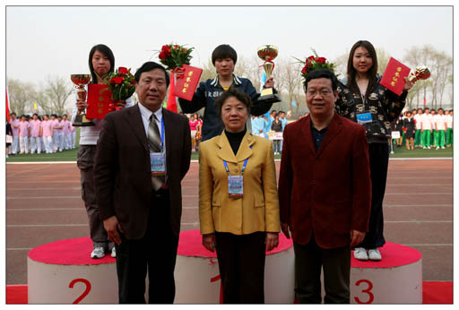 校党委副书记高东、副校长杜晓林、副校长姚允聪为学生组运动成绩女子团体总分前三名获奖单位颁奖。