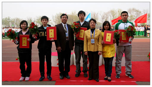 党委书记王慧敏、校长王有年、校党委副书记高东为学生组运动成绩男、女团体总分前三名获奖单位颁奖。