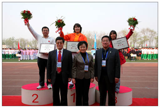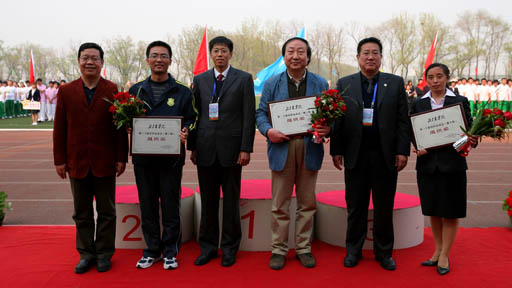 校党委书记王慧敏、校长王有年、纪委书记朱生利为教工组运动成绩团体总分前三名获奖单位颁奖。