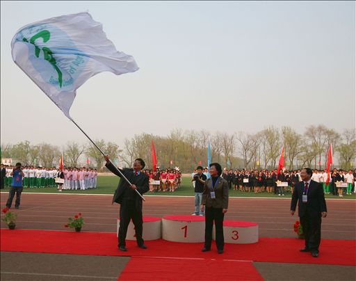 伴随着印有“农”字的运动会会旗徐徐降下,此次运动会接近了尾声,会场上隆重举行运动会会旗交接仪式。此次运动会承办单位经济管理学院院长何忠伟将会旗交予党委书记王慧敏,下届运动会承办单位城乡发展学院院长刘克锋从党委书记王慧敏手中接过会旗,并挥舞会旗向全校师生示意。
