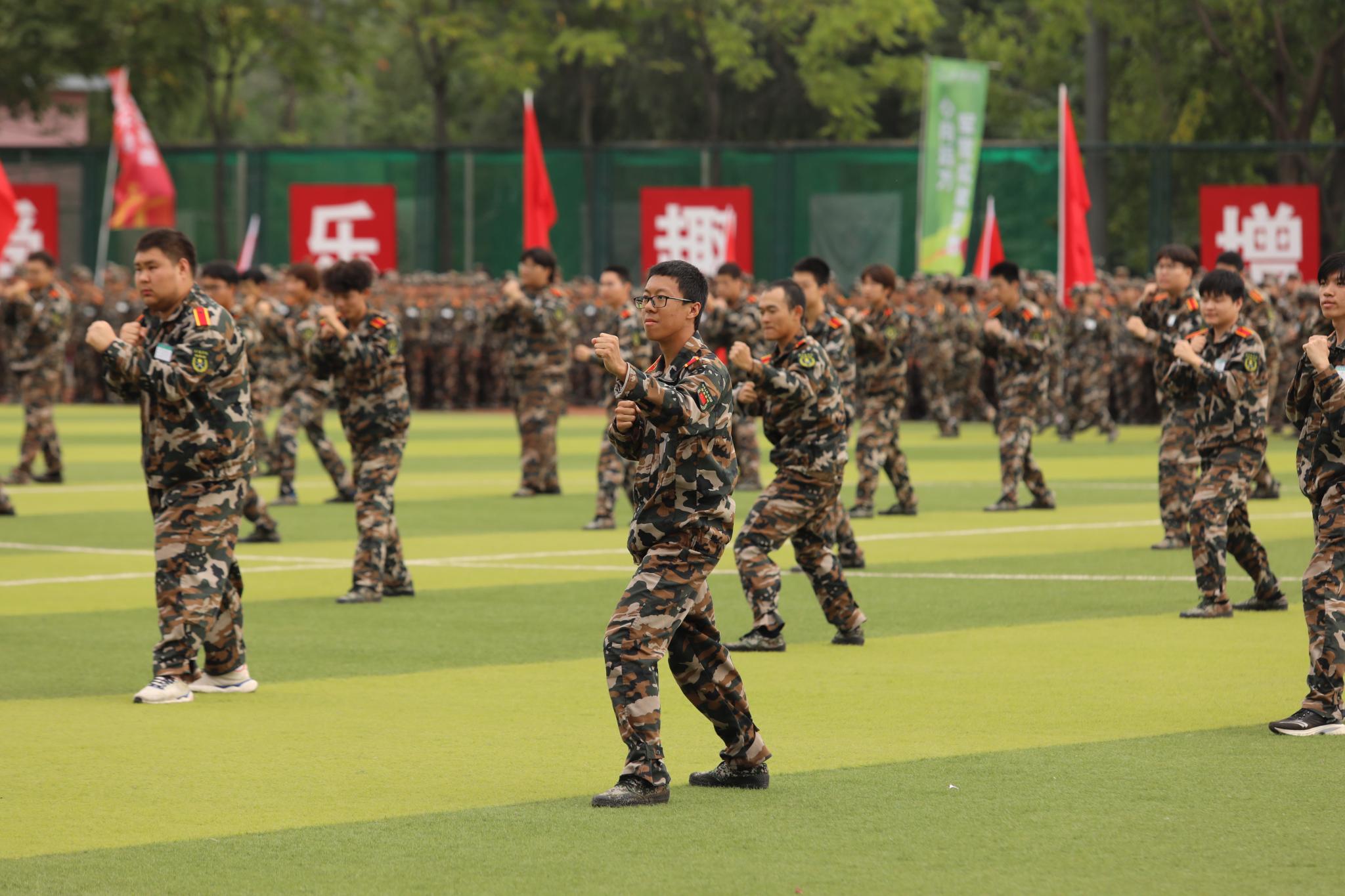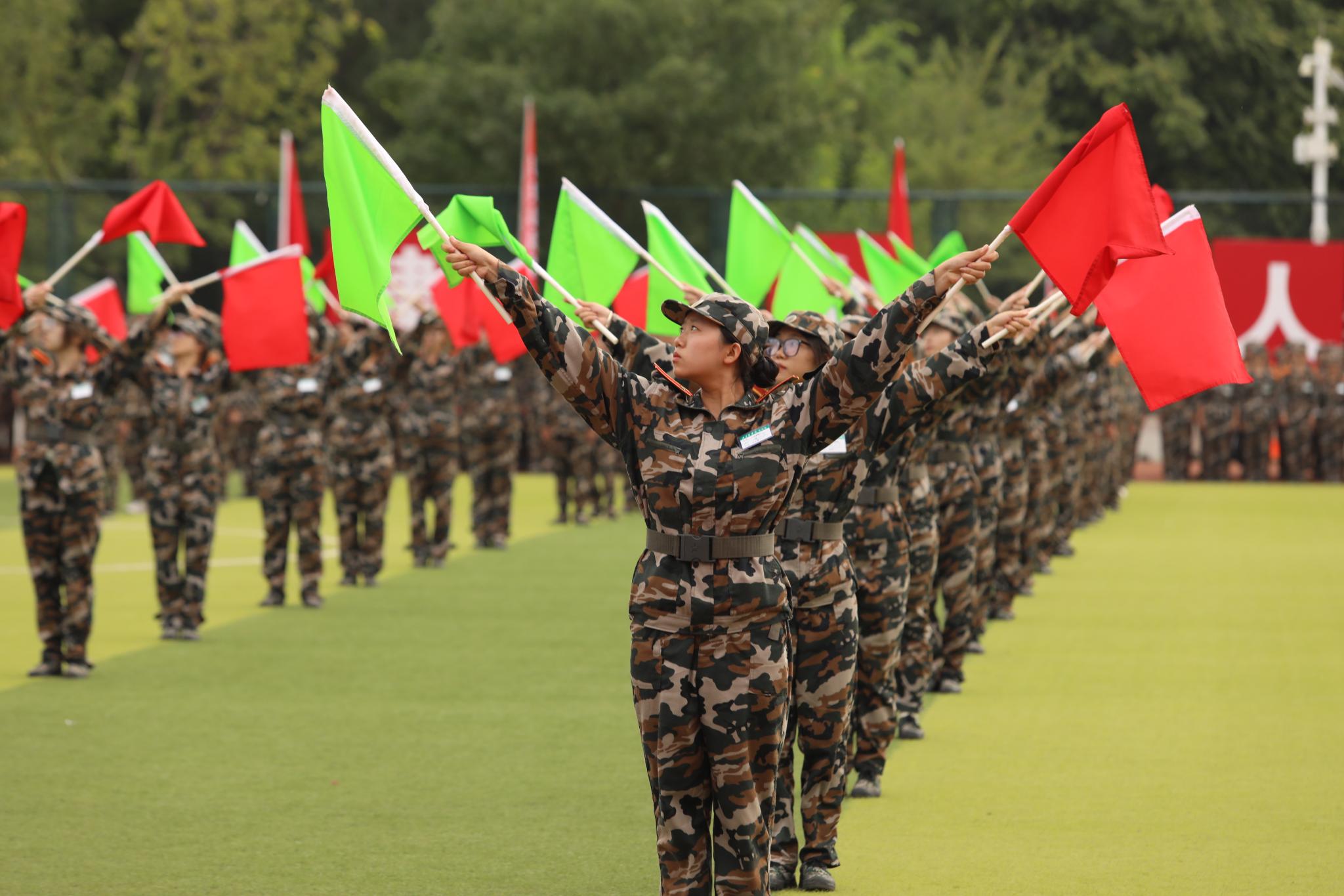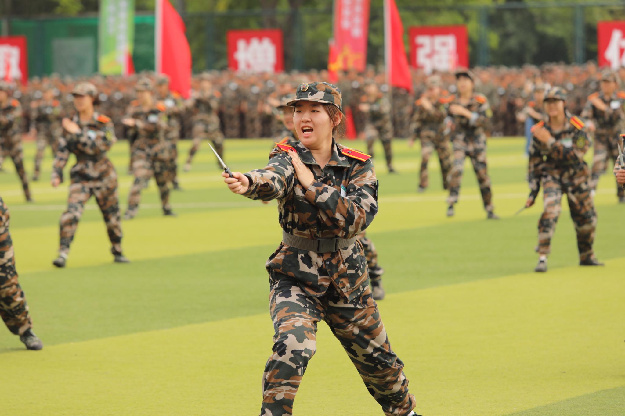 军训学员进行了分列式展示和特色科目汇报表演。同学们方阵整齐,步伐铿锵,口号嘹亮,精神饱满,斗志昂扬。