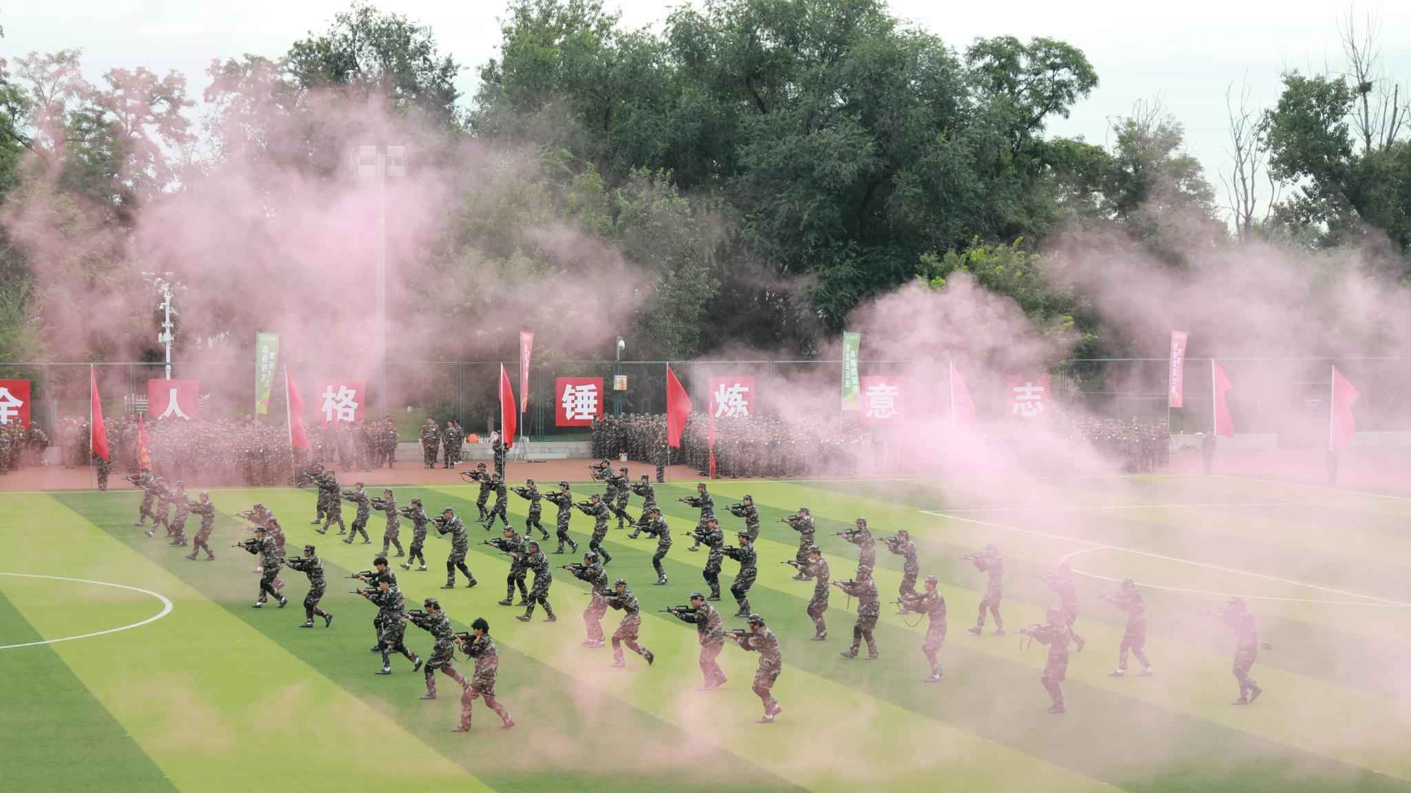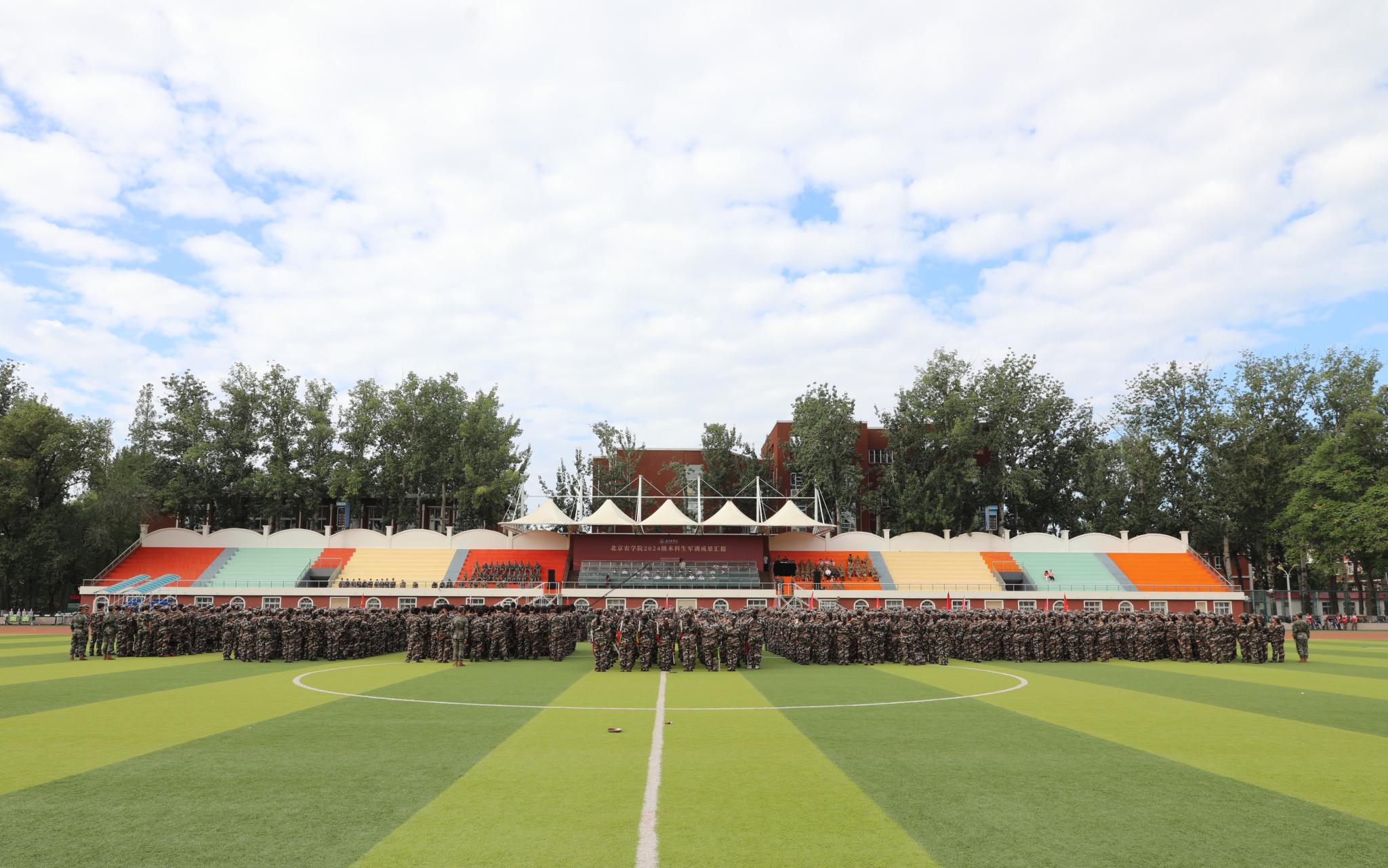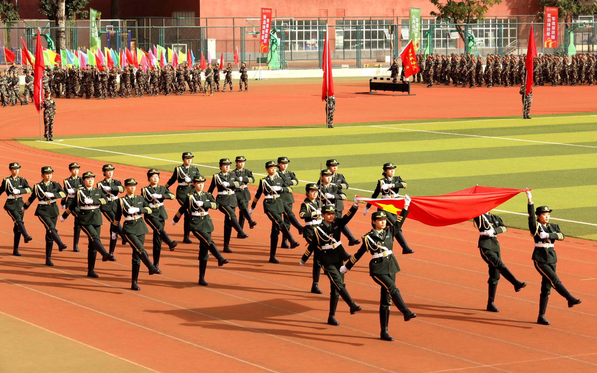 相关职能部门和二级学院负责人,带训教官、随训教师,辅导员、班主任、全体参训学员参加军训成果汇报展示活动。