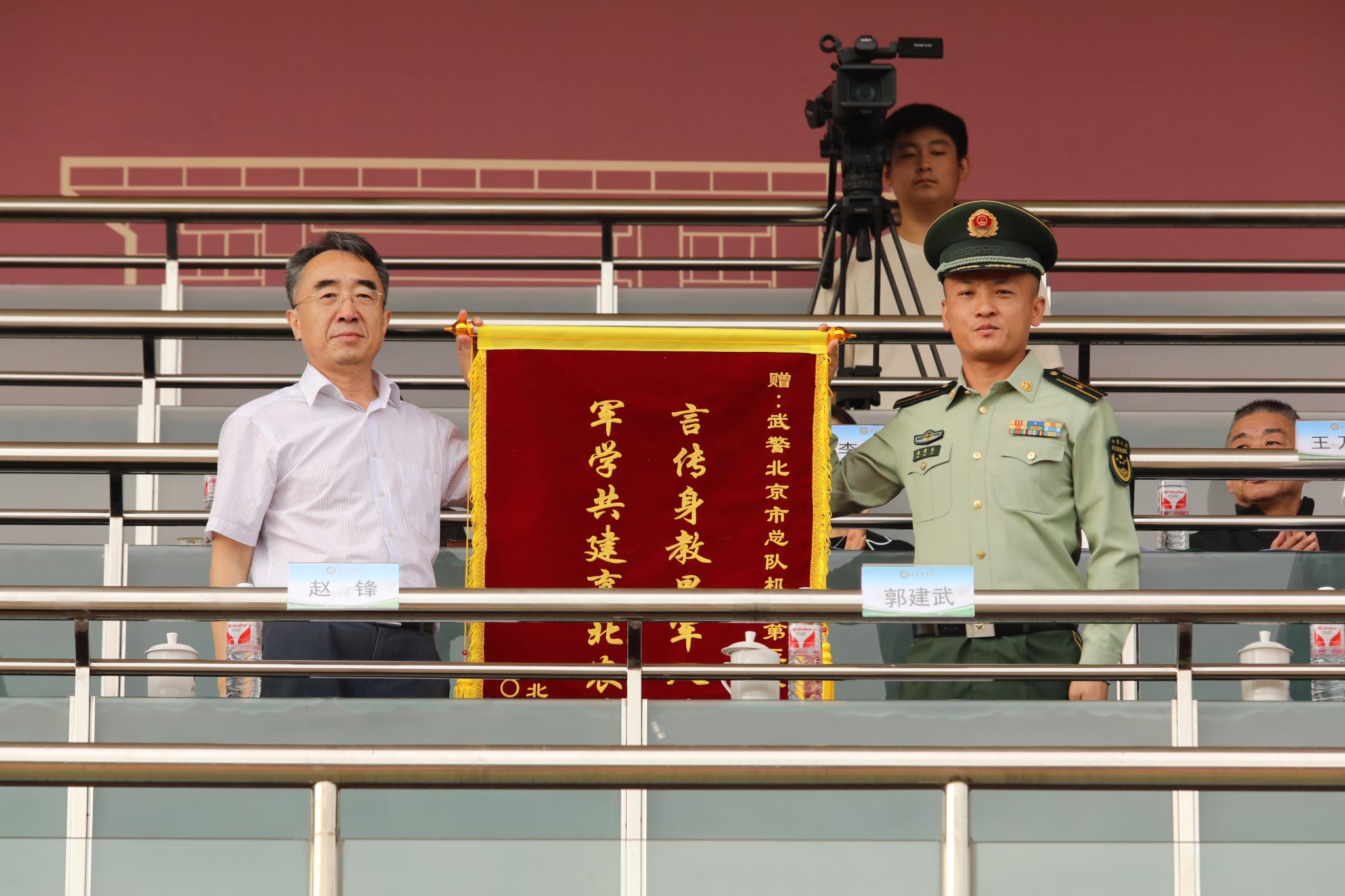 赵锋代表学校向承训单位赠送锦旗并表示衷心感谢,希望以此次军训为契机,双方进一步加强交流合作,共同为培养可堪大用能担重任的栋梁之才作出更大贡献。