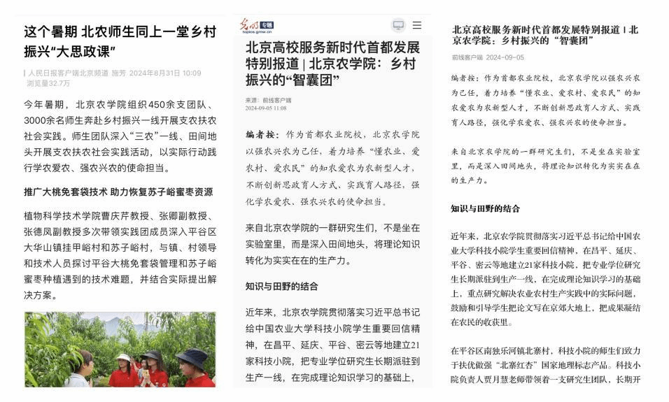 学校首创“一家主建、多家共享、社会共用”原则,先后在昌平兴寿镇辛庄村、密云溪翁庄镇金叵罗村、怀柔北房镇大周各庄村、平谷峪口镇建立乡村振兴驿站,深度融入“百千工程”建设。整合农业科技与人才资源,多学科、全链条服务乡村全面振兴。学校团队承担的北京市的“数字京村”项目在“百千工程”第一批19个示范村推广应用。持续推进校地合作,与门头沟区、昌平区教委等签订战略合作协议。实施科技特派员特色服务行动,巩固提升16个集体经济薄弱村“消薄”成效,高质量完成北京市农业农村重点工作。推进校城融合发展,7位教师成功入选第二批昌平区“科技副总”,优化校地技术供需对接机制。新增2个案例入选教育部省属高校精准帮扶典型项目,是市属高校中唯一连续四届共5个案例入选该项目的学校。