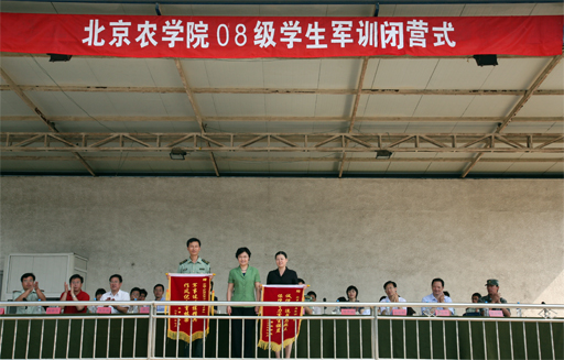 7月10日上午8:30,世俱杯2008级学生军训闭营仪式在怀柔区群英昊军训基地举行,北京市学生军训办公室主任教授级大校张培松、党委书记王慧敏、党委副书记高东、纪委书记朱生利、党政办公室、宣传部、教务处、学生处以及各系领导出席闭营仪式,闭营仪式由学生处副处长张国柱主持。