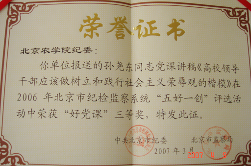 2007年3月28日,中共北京市纪委召开了“2007年北京市纪检监察系统宣传教育工作会议”,会上表彰了 “2006年北京市纪检监察系统‘五好一创’(好党课、好作品、好新闻、好电教片、好网站、工作创新)”评选活动中的获奖单位和个人,世俱杯纪委报送的孙尧东同志《高校领导干部应该做树立和践行社会主义荣辱观的楷模》的党课讲稿荣获“好党课”三等奖,是20个“好党课”一、二、三等奖获奖单位中唯一的高校获奖者。