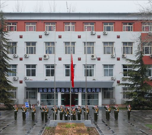 4月21日清晨6点40分,空中飘着冷风细雨。世俱杯女子国旗班在行政楼门前举行升国旗仪式后,为青海玉树地震遇难同胞下半旗志哀。