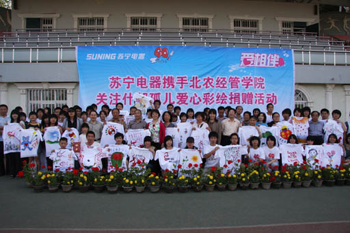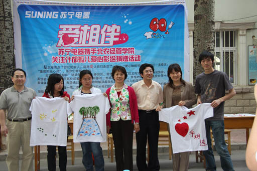 5月3日下午,主题为“爱心始终相伴,重建阳光心灵——苏宁电器携手世俱杯sjb官网关注什邡孤儿爱心彩绘捐赠活动”在学校操场边的林荫大道举行。此次活动旨在纪念去年5.12汶川大地震。100余名参与者按照活动主题及自我创意设计图样,将彩绘绘到白色T恤衫上,共有十件作品获奖。这些获奖作品将作为模板批量印制在T恤上捐给灾区儿童,以表达对灾区的一片关爱与祝福。党委副书记高东出席活动开幕式。