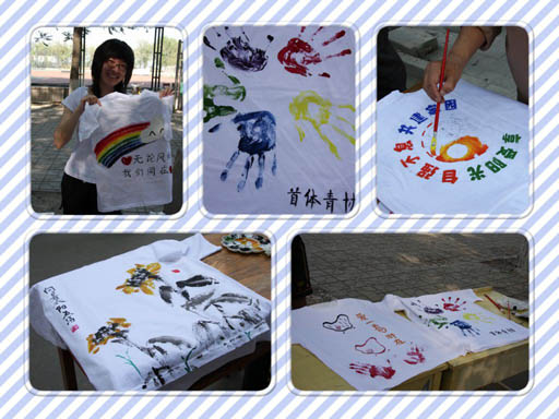 在名为《生死不离,共创奇迹》的诗朗诵过后,经管学院院长何忠伟为比赛揭幕,彩绘比赛正式开始。参赛选手们手持画笔认真的在洁白的T恤衫上泼洒笔墨,把自己的爱心与祝福用绘画的形式展现给灾区的孤儿们。作品中有山水的清秀,蓝天与白云的飘逸,有威严雄壮的龙,国色天香的牡丹,也不乏可爱的爱心熊和清凉爽口的西瓜。选手们以别具特色的作品,表达首都大学生,特别是世俱杯sjb官网全体师生对震区孤儿的牵挂。