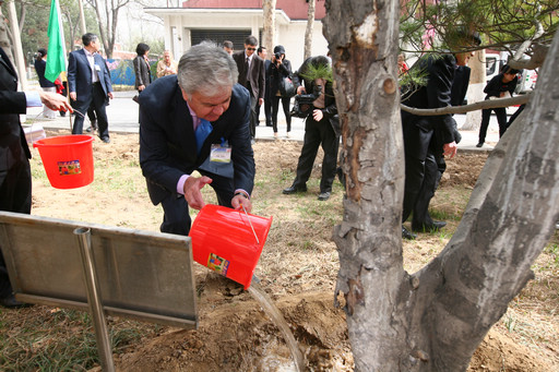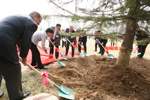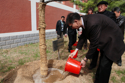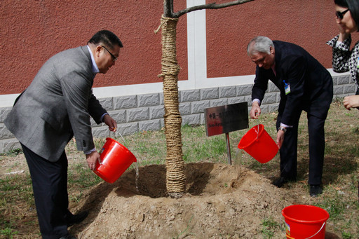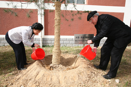 党委书记王慧敏、副校长杜晓林和来宾共同栽种了中亚国际友谊树。