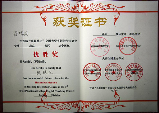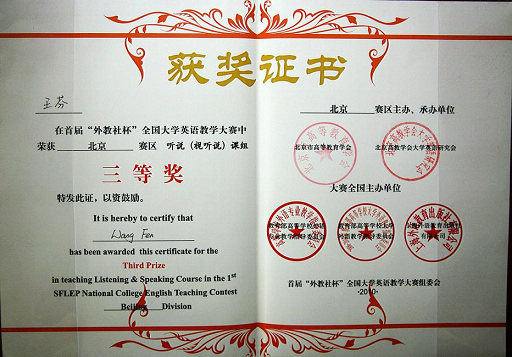 5月21-23日,由教育部高等学校外语专业教学指导委员会、教育部高等学校大学外语教学指导委员会、上海外语教育出版社主办,北京市高等教育学会、北京高教学会大学英语研究会承办的首届“外教社杯”全国大学英语教学大赛在首都师范大学国际文化大厦隆重举行。世俱杯外语教学部青年教师王芬获听说(视听说)课组第三名,张德凤获综合课组优胜奖。