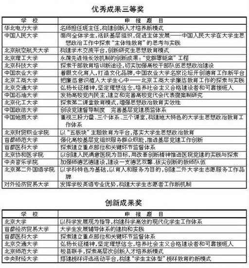 经过专家评审委员会评审,并经市委教育工委委员会审定,获奖优秀成果32项,其中一等奖3项,二等奖10项,三等奖19项。创新成果奖6项。