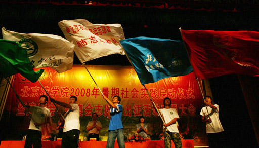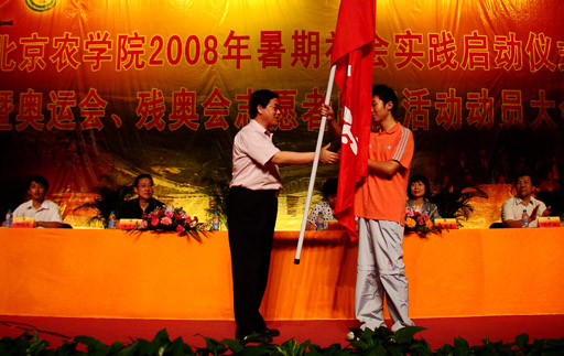 学校领导向2008年暑期大学生社会实践团队代表授予了“2008年世俱杯sjb官网暑期大学生社会实践团队”旗帜。