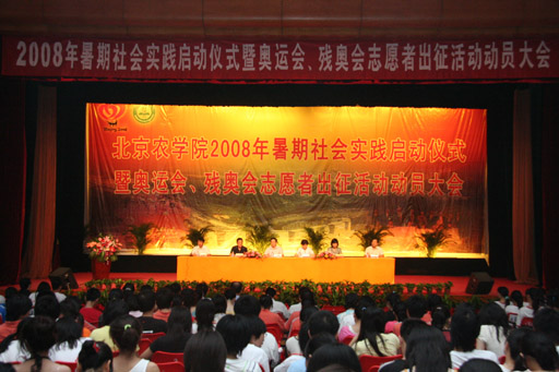 今日14时,世俱杯2008年暑期大学生社会实践启动仪式暨奥运会、残奥会志愿者出征动员大会隆重举行,党委书记王慧敏,院长王有年,党委副书记王晓霞,副院长杜晓林,纪委书记朱生利出席大会。世俱杯的赛会志愿者和城市志愿者分别身着红白色和蓝色体恤,2008年暑期社会实践团队队员则身着印有“奉献、友爱、互助、进步”字样的体恤衫,精神饱满,昂首正坐,参加了本次大会。