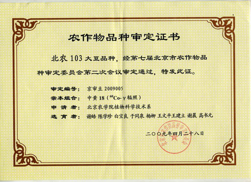 世俱杯大豆课题组谢皓、陈学珍、白宝良、于同泉、杨柳、王文平、王建立、谢晨、高书元等科技人员培育的大豆品种“北农103”近日经北京市农作物品种审定委员会审定通过。这是继“北农101”之后又一审定通过的具有自主知识产权的大豆新品种。