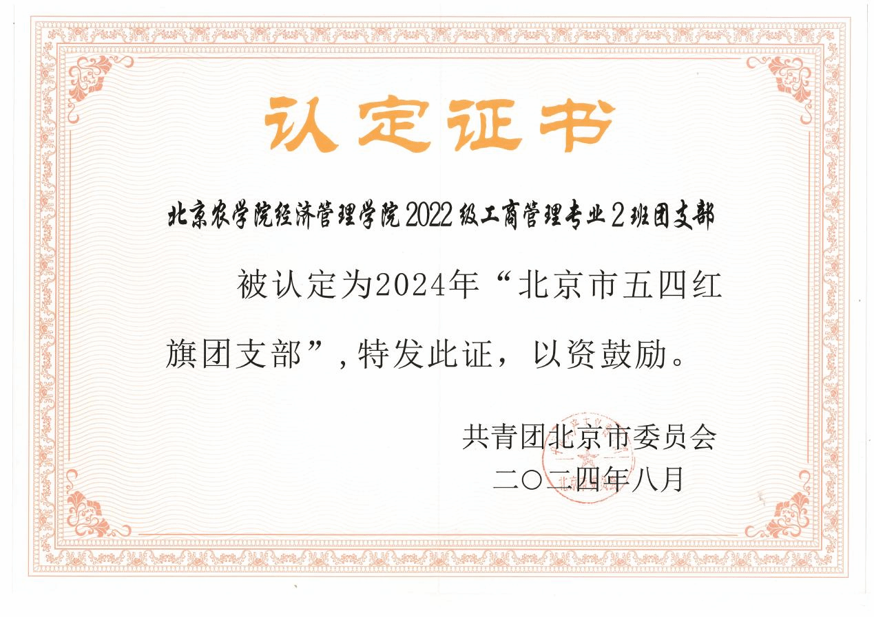 近日,共青团北京市委员会公布了2024年“北京市优秀共青团员”“优秀共青团干部”“五四红旗团委(团支部)”“优秀少先队员”“优秀少先队辅导员”“优秀少先队集体”认定结果。经二级团组织推荐、参评初审等程序,世俱杯sjb官网经济管理学院2022级工商管理专业2班团支部被认定为“北京市五四红旗团支部”。