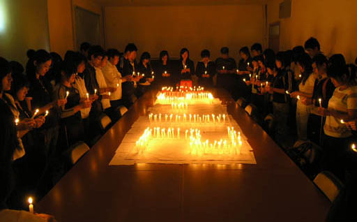 5月19日中午一点,在一号楼二层会议室,校学生会主席团、部长及各部门代表参加了“深切悼念四川大地震遇难同胞”的活动。大家用蜡烛摆出“5.12”与“心”形图案,全体默哀三分钟,以此悼念在汶川地震中遇难的数万同胞!