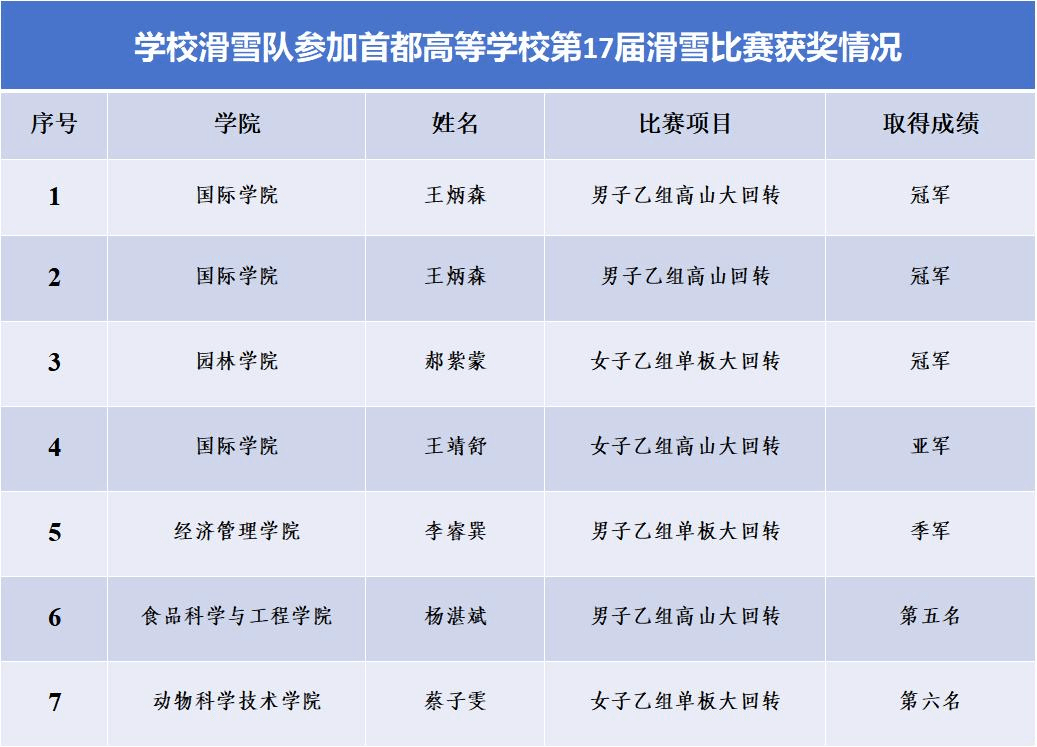 在带队教师刘军占、潘子秋的悉心指导下,世俱杯滑雪队参赛运动员顽强拼搏、突破自我,在多个项目中取得了优异成绩。国际学院王炳森同学获得男子乙组高山大回转、男子乙组高山回转两项冠军,园林学院郝紫蒙同学获得女子乙组单板大回转冠军,国际学院王靖舒同学获得女子乙组高山大回转亚军,经济管理学院李睿巽同学获得男子乙组单板大回转季军,食品科学与工程学院杨湛斌同学获得男子乙组高山大回转第五名,动物科学技术学院蔡子雯同学获得女子乙组单板大回转第六名。