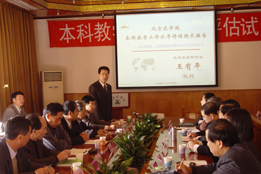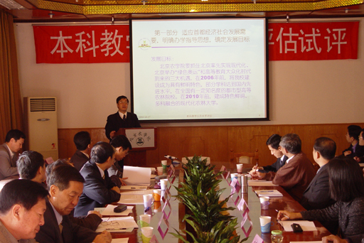 王有年校长从适应首都发展需要,明确办学指导思想,确立发展目标;坚持质量立校,明确本科教学思路;本科教学工作的主要措施;学校的办学特色;工作成效等五个方面代表学校进行自评工作的汇报。