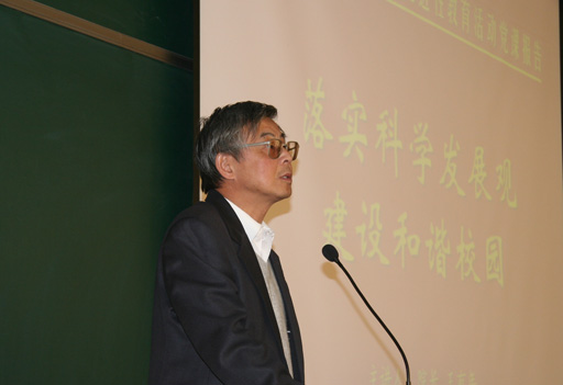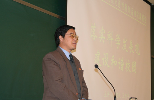 王有年同志从坚持科学发展观、建设和谐社会出发,进一步谈到建设和谐校园。他从建设大学精神、创新和丰富大学文化和建设和谐校园的途径等三个方面重点论述了学校如何建设和谐校园。
