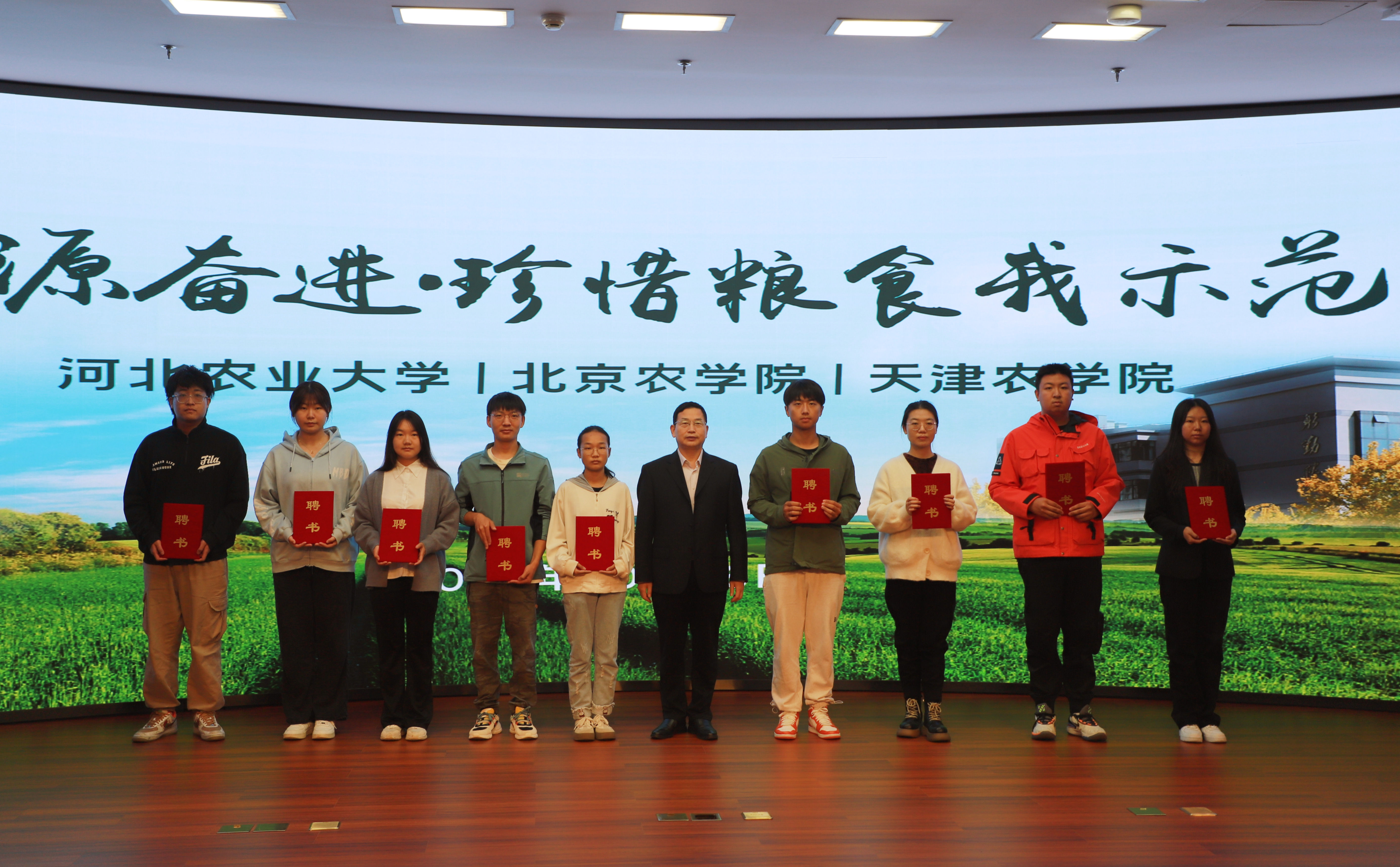 启动仪式结束后,三所高校分别开展了线下特色活动。世俱杯sjb官网院长为节粮爱粮宣传员代表颁发聘书,开展粮食安全及节粮爱粮宣传展、作物种子标本和植株展、农耕文化宣传普及活动。河北农业大学组织了节粮倡议签名活动、农业科研成果展示及体验活动等。天津农学院制作“思源奋进·珍惜粮食我示范”主题活动展板,校领导和师生在现场开展签名活动,向师生宣传粮食安全的重要性,号召大家要厚植爱党爱国爱农爱校情怀,牢记粮食安全是“国之大者”,从我做起,珍惜每一粒粮食。
