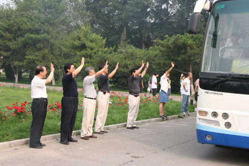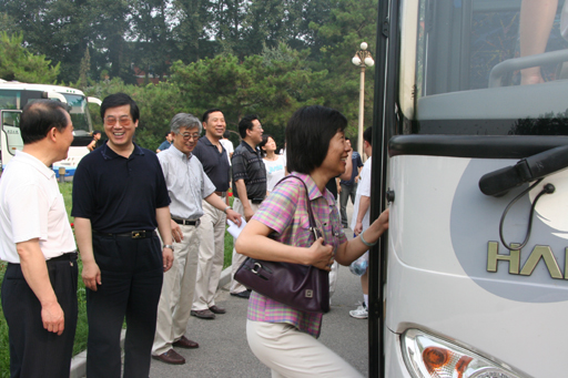 (校领导欢送学生上车并嘱咐他们要好好工作、常回家看看!)