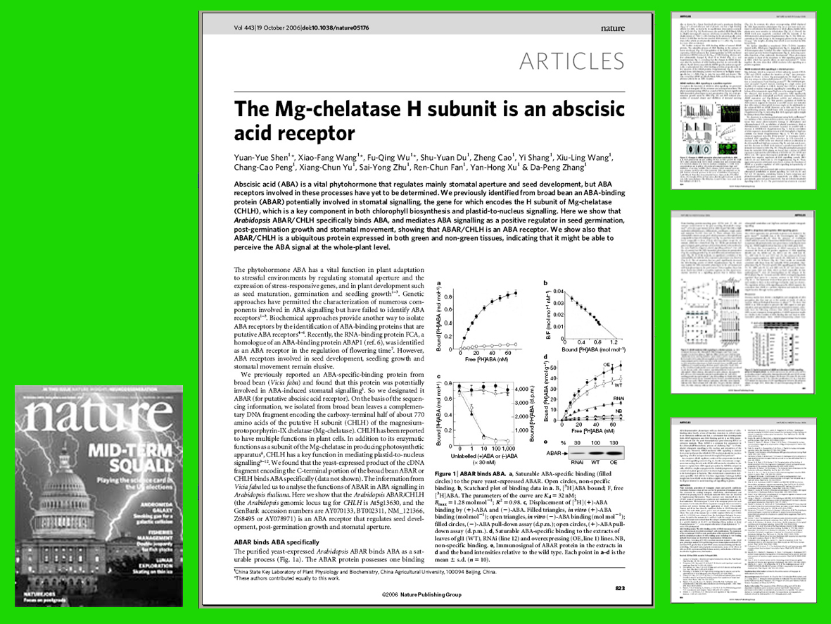 中国农业大学生物学院的一个课题组首次发现了一种参与叶绿素生物合成的蛋白质——植物脱落酸(ABA)受体,从而找到了控制植物气孔运动和种子发育的“钥匙”。10月出版的《自然》杂志,以主题论文的形式发表了这一研究成果。