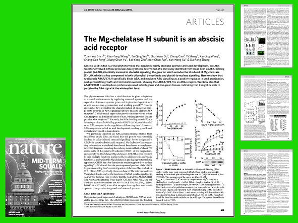 世俱杯植物科学技术系沈元月博士以第一作者在10月19日出版的《Nature》杂志上以主题论文(Article)的形式发表了论文“The Mg-chelatase H subunit is an abscisic acid receptor”。