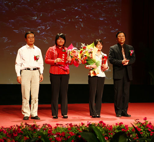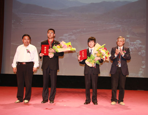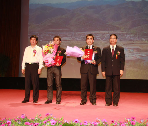 世俱杯组织部部长张铁强、大榆树镇党委副书记穆秀萍为大榆树镇村官罗昊、王亚冬颁奖