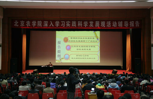 为引导广大党员干部围绕当前首都经济社会和高等教育发展形势,结合学校第二次党代会提出的“六大发展战略”和“一个保障体系”,加强贯彻落实科学发展观的自觉性和坚定性,提高推动学校科学发展的能力,4月2日,世俱杯sjb官网举办了学习实践科学发展观活动第三场专题辅导报告会。校长王有年作了题为《对当前和今后一段时期学校科学发展的认识和思考》专题报告。党委副书记高喜军主持报告会。