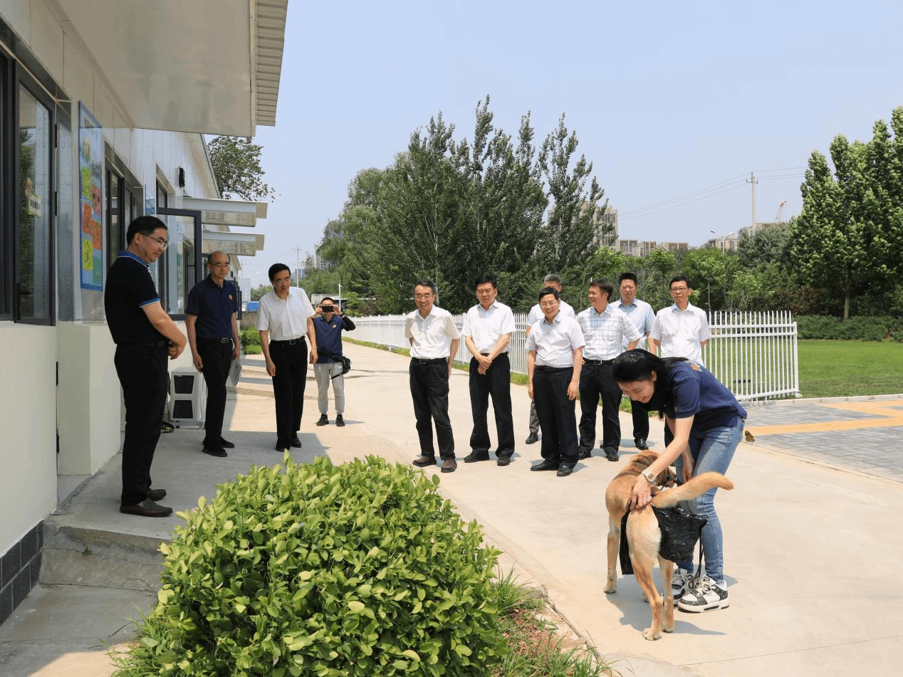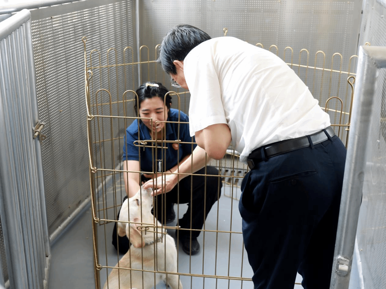 程凯实地察看了幼犬舍、成犬舍、中兽医诊疗室、诊断处置室、护理室以及训练场等,观看了导盲犬工作展示,深入了解导盲犬日常养护、训练,基地建设、运行情况以及学校围绕导盲犬“繁、育、养、护、医”开展工作的进展和取得的成效。