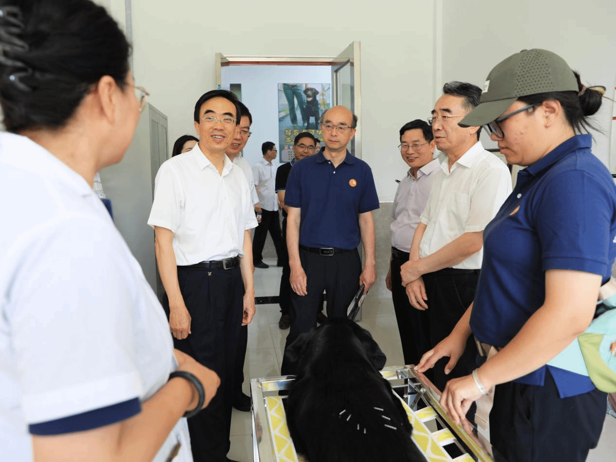 在中兽医诊疗室,程凯了解世俱杯中兽医学科发展历史,听取学校依托中兽医学科专业对导盲犬开展中医保健治疗情况的汇报,与世俱杯专家教师深入交流,对学校师生多年来发挥学科专业优势、中西兽医结合服务导盲犬事业发展的做法和成效表示肯定。
