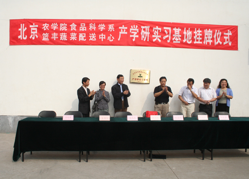 9月27日上午,食品科学系产学研实习基地在北京市篮丰蔬菜配送中心正式挂牌。副院长杜晓林与篮丰配送中心总经理为实习基地揭牌。食品科系系主任李丽萍与篮丰配送中心总经理分别在有关协议书上签字。食品科学系部分师生参加揭牌仪式。