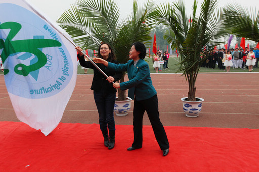 园林学院以精彩的文艺表演接过下届运动会承办的任务。在会旗交接仪式上,此次运动会承办单位城乡发展学院院长刘克锋将会旗交予党委书记王慧敏,园林学院院长马晓燕从党委书记王慧敏手中接过会旗,完成了任务的正式交接。