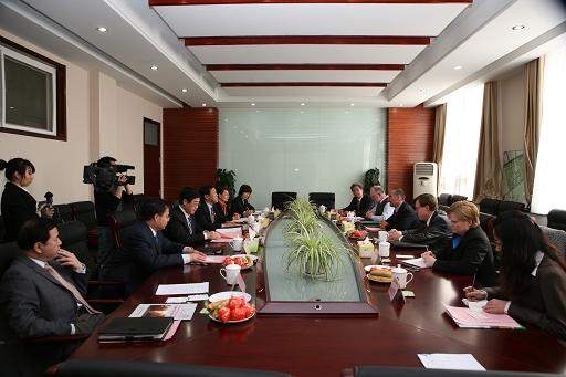 会上,校长王有年用英文对外宾的到来表示热烈欢迎,并简要介绍了学校的基本情况。Dr. Richard McCallum也向与会人员介绍了狄克森州立大学的地理位置、学习环境、院系设置等基本情况。双方主要针对两校相关专业的对接进行了深入研讨。双方都真诚地希望今后能有长远的合作与交流。会谈在愉快而友好的氛围中进行。