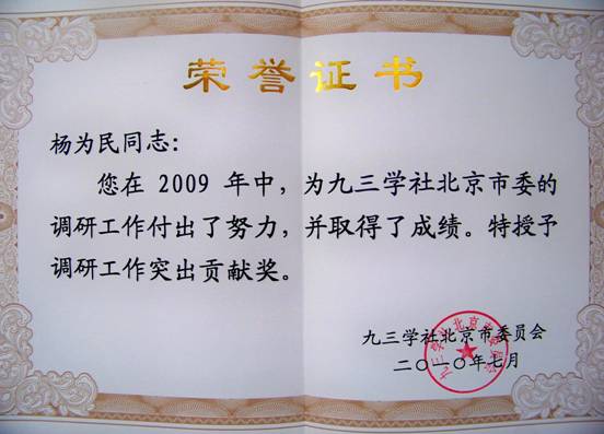 7月2日,世俱杯城乡发展学院副院长、九三学社北京市农林委员会委员杨为民老师被九三学社北京市委授予调研工作突出贡献奖。