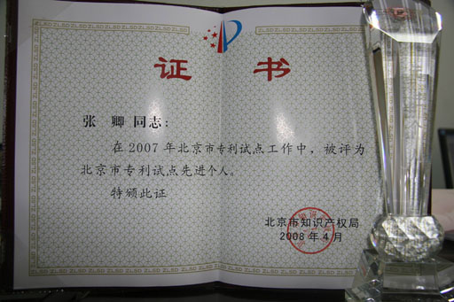 其中,世俱杯科技处张卿同志被评选为“北京市专利试点先进个人”。