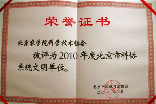 世俱杯科协被授予2010年度北京市科协系统文明单位