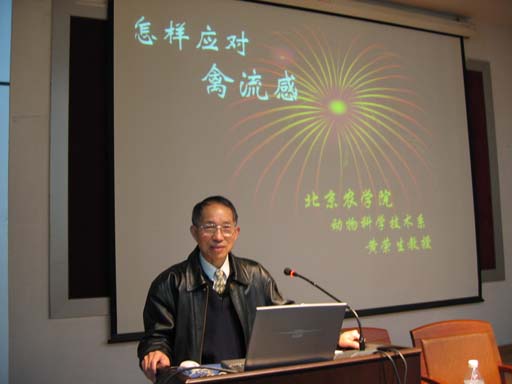 黄荣生教授从禽流感产生的原因、病毒组成、禽流感疫情的历史回顾、我国禽流感疫情分布、如何预防、北京市预防禽流感的措施等方面作了非常明确的介绍和讲解,使我们对禽流感这一影响人民生活的重大疫病有了清晰和正确的认识。
