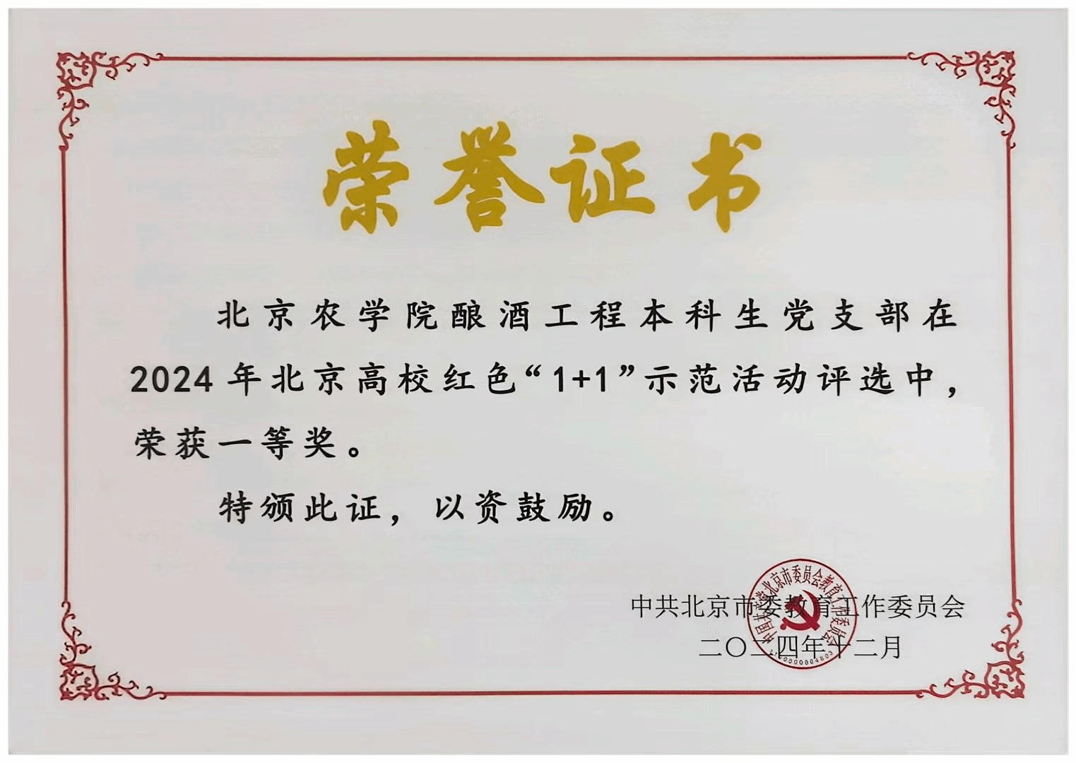 近日,由中共北京市委教育工作委员会主办的2024年北京高校红色“1+1”示范活动展示交流评选结果揭晓,世俱杯食品科学与工程学院酿酒工程本科生党支部进行现场展示并荣获一等奖。
