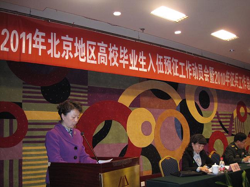 4月28日,2011年北京地区高校毕业生入伍预征工作动员会暨2010年征兵工作总结会隆重召开,市教委副主任付志峰,市征兵办公室常务副主任、卫戍区周永杉副参谋长、北京卫戍区动员处处长宋协鹏、市教委学生处处长沈聪伟以及北京地区高校主管征兵工作的校领导和征兵工作人员参加了大会。会上,市教委副主任付志峰代表北京市教委总结2010年冬季征兵工作,布置2011年预征兵工作。四所高校及北京市昌平区武装部就2010年征兵工作介绍了工作经验。