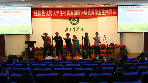 在精彩的宣讲活动中,大学生“村官”艺术团表演的话剧《承诺》将宣讲会的气氛推上了高潮,这些来自延庆县各乡镇的大学生“村官”用真实的素材和生动的表演,展现了他们在延庆的“村官”生活。随后,来自延庆县的三位优秀“村官”代表向现场师生介绍了他们在各自岗位上的优秀事迹。沈家营镇临河村的党支部书记助理蔡立泷成了村里的“孩子王”;延庆镇八里庄村村委会主任助理张辛来福在农村将他的二胡梦想变成了村里更多人的希望;原珍珠泉乡小川村村委会助理马俊飞更是在长期监护和照顾村内患有精神疾病的孤寡老人郭仕祥的过程中收获了人生的真谛。现场师生无不被他们的事迹感染,报告厅内不时响起阵阵掌声。